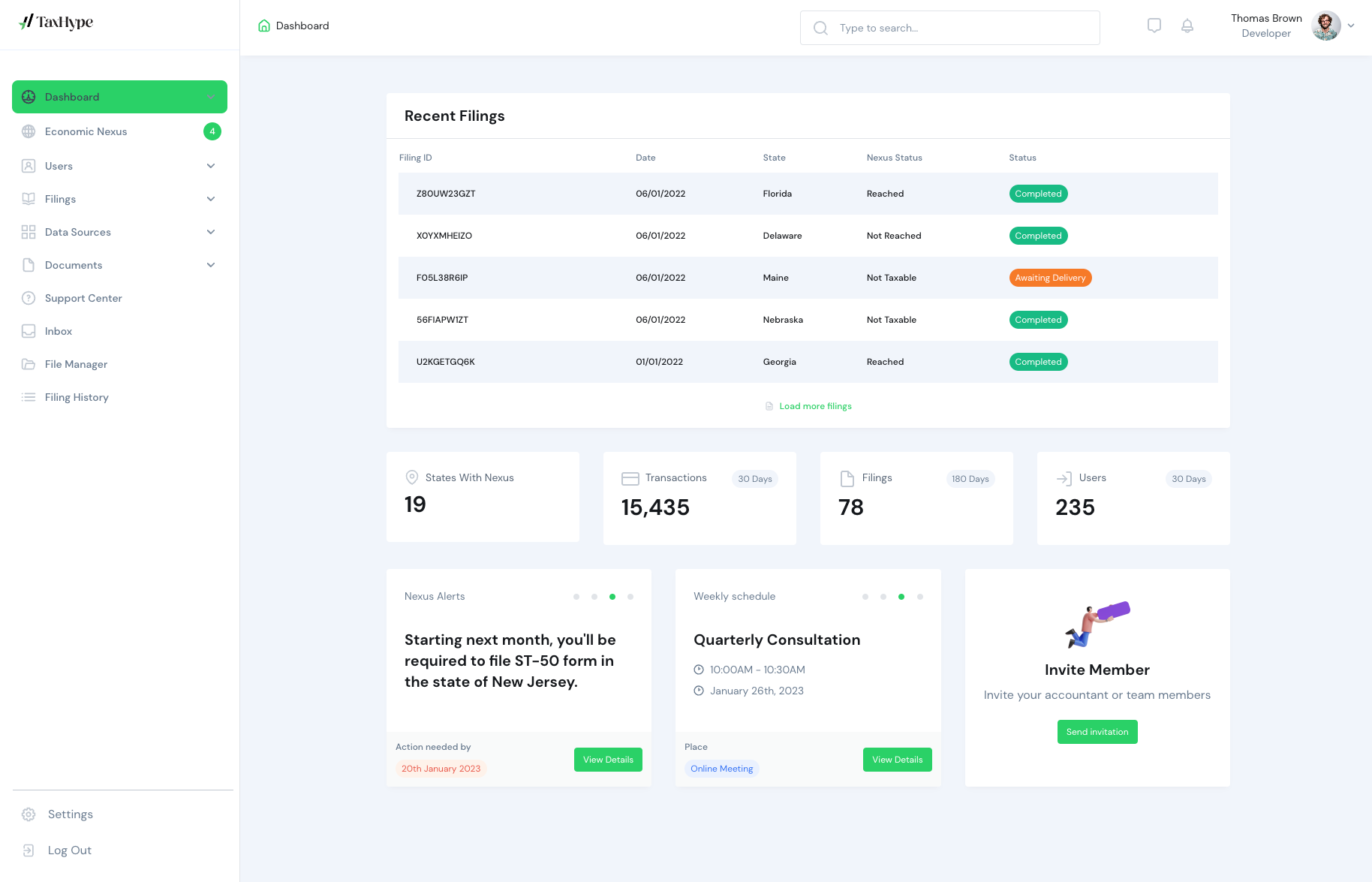 TaxHype's user-friendly dashboard makes compliance simple and easy. With its intuitive design, you can easily navigate and manage your sales tax compliance. Whether you're a small business owner or an accountant, you'll find our dashboard to be an essential tool for staying compliant.